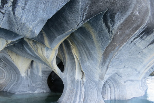 Las aguas del lago han erosionado los escarpes costeros, creando estas formaciones que incluyen cavernas e islotes. Algunas pequeñas embarcaciones zarpan desde Puerto Río Tranquilo, que en algunos casos pueden recorrer interiormente las cavernas.